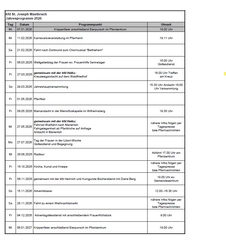 Das Jahresprogramm der kfd St. Joseph, Mastbruch: