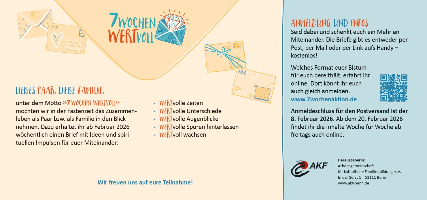 Paare und Familien mit Kindern im Grundschulalter erhalten hier jedes Jahr in der Zeit zwischen Aschermittwoch und Ostern einen bunten Mix aus Impulsen für ihr Zusammenleben.