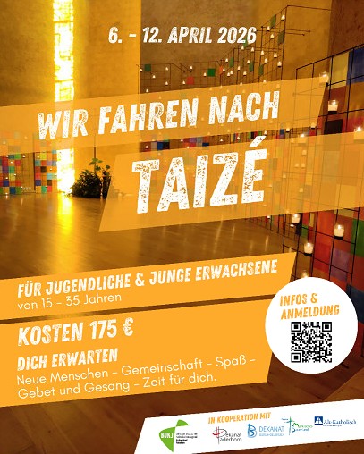 Der BDKJ Kreisverband Paderborn e.V. bietet in Kooperation mit dem Dekanat Paderborn, dem Dekanat Büren-Delbrück und dem Dekanat Märkisches Sauerland eine Taizéfahrt in der Osterwoche (06.-12.04.26) an. Die Busfahrt richtet sich an junge Menschen zwischen 15 und 35 Jahren. Start ist in der Nacht zum Ostermontag, die Rückkehr am Sonntag. Alle sind herzlich eingeladen, eine besondere Woche voller Gemeinschaft, Gebet und Begegnung zu erleben. Alle Infos und den Link zur Anmeldung gibt es hier: Taizéfahrt – BDKJ Kreisverband Paderborn