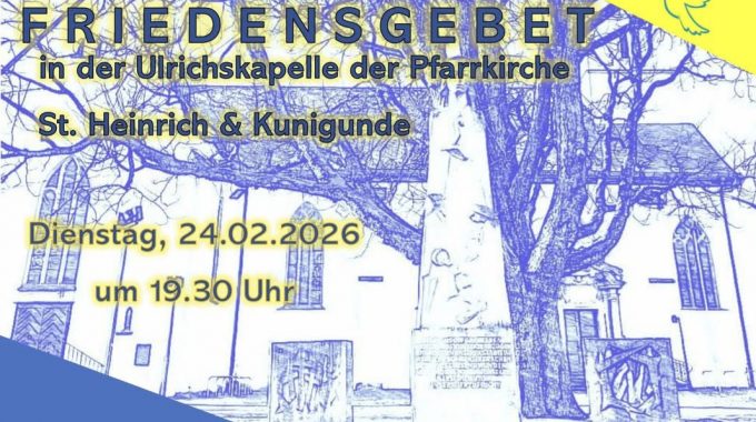 Seit dem Angriff Russlands gegen die Ukraine am 24. Februar 2022 sind jetzt vier Jahre vergangen. Daran erinnern unsere Kirchen in Schloß Neuhaus und haben das ökumenische Friedensgebet in diesem Monat genau auf denselben Kalendertag gelegt. Wir laden ein zu diesem bereits 65. Friedensgebet am Dienstag, 24. Februar, 19:30 Uhr in die Ulrichskapelle unserer Pfarrkirche.