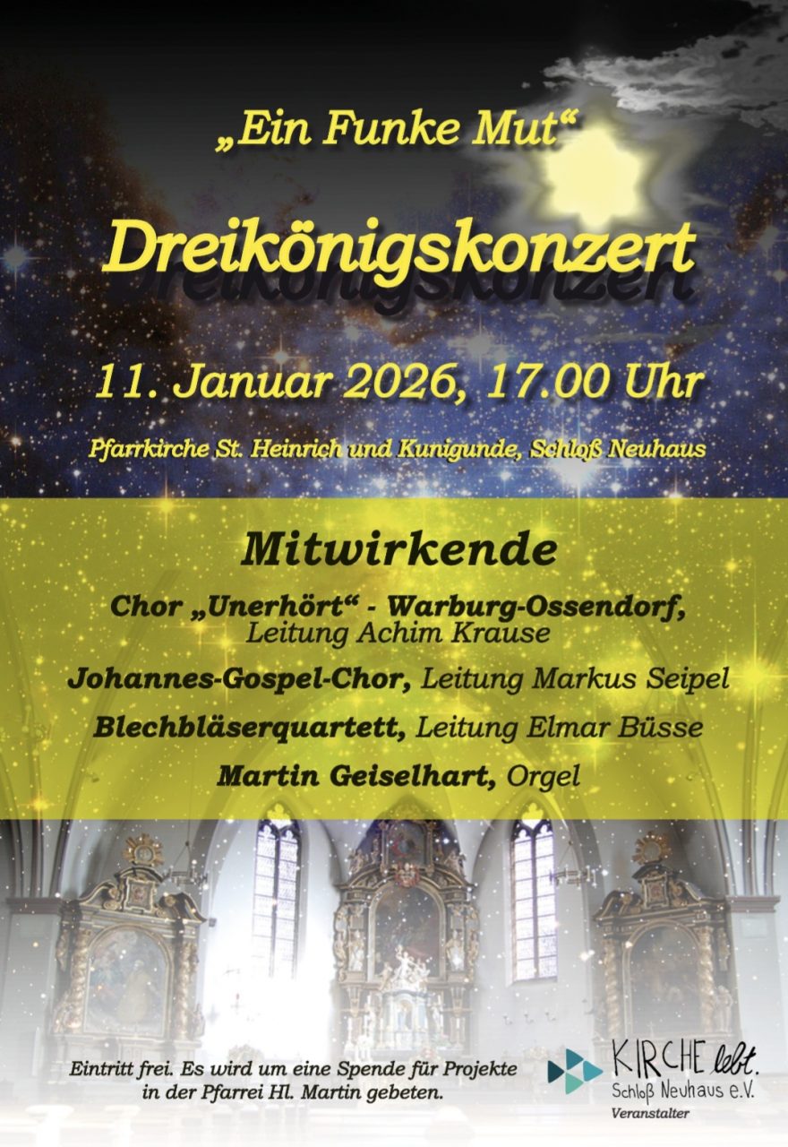 Zum Ende der Weihnachtszeit können wir uns wieder auf das traditionelle Dreikönigskonzert freuen, wozu „Kirche lebt.Schloß Neuhaus e.V.“ zum 17. Mal einlädt. „Ein Funke Mut“ ist das Motto, das vom Leitwort der aktuellen Aktion des Friedenslichts von Bethlehem stammt. So erinnert das Konzert an den Mut der Dreikönige, die sich auf den Weg nach Bethlehem gemacht haben, und will Mut machen zum neuen Jahr 2026. Das Konzert beginnt am 11. Januar 2026 um 17 Uhr in der Pfarrkirche St. Heinrich u. Kunigunde.