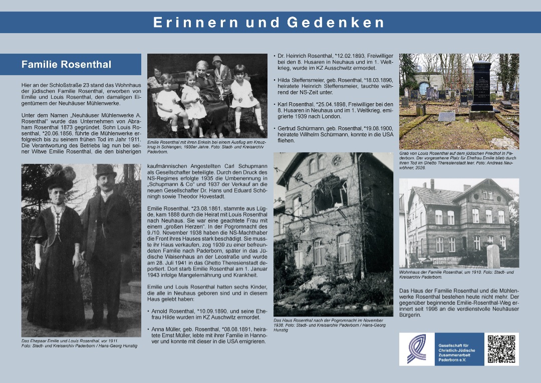 Der durch die Pader-Aue verlaufende Emilie-Rosenthal-Weg erinnert an unsere jüdische Mitbürgerin Emilie Rosenthal im damaligen Neuhaus, nach dem Tod ihres Ehemannes Louis Inhaberin der Neuhäuser Mühlenwerke. Sie war in der Gemeinde vielfach sozial engagiert, wurde von den Nazis zum Verkauf der Mühle und ihres Hauses gezwungen und kam 1943 im Ghetto Theresienstadt um. Zwei ihrer Söhne und eine Schwiegertochter wurden im KZ Auschwitz ermordet. Am 17. April 1996 erfolgte in Gegenwart von fünf Enkeln die Benennung des Weges nach ihr. Die Pfarrei hat damals großen Anteil genommen. Erinnerungsworte ihrer Familie wurden in den Gottesdiensten verlesen. Genau 30 Jahre danach wird nun an der Bushaltestelle „Emilie-Rosenthal-Weg“, Schloßstraße 23, wo das Wohnhaus der Familie stand und der Weg beginnt, eine Tafel zur Erinnerung an Familie Rosenthal enthüllt. Dazu ergeht eine herzliche Einladung. Es wäre ein schönes Zeichen, wenn viele aus der Gemeinde teilnehmen.