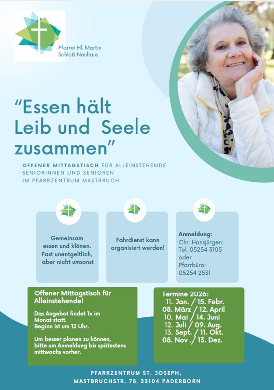 Offener Mittagstisch für alleinstehende Seniorinnen und Senioren im Pfarrzentrum St. Joseph Mastbruch.