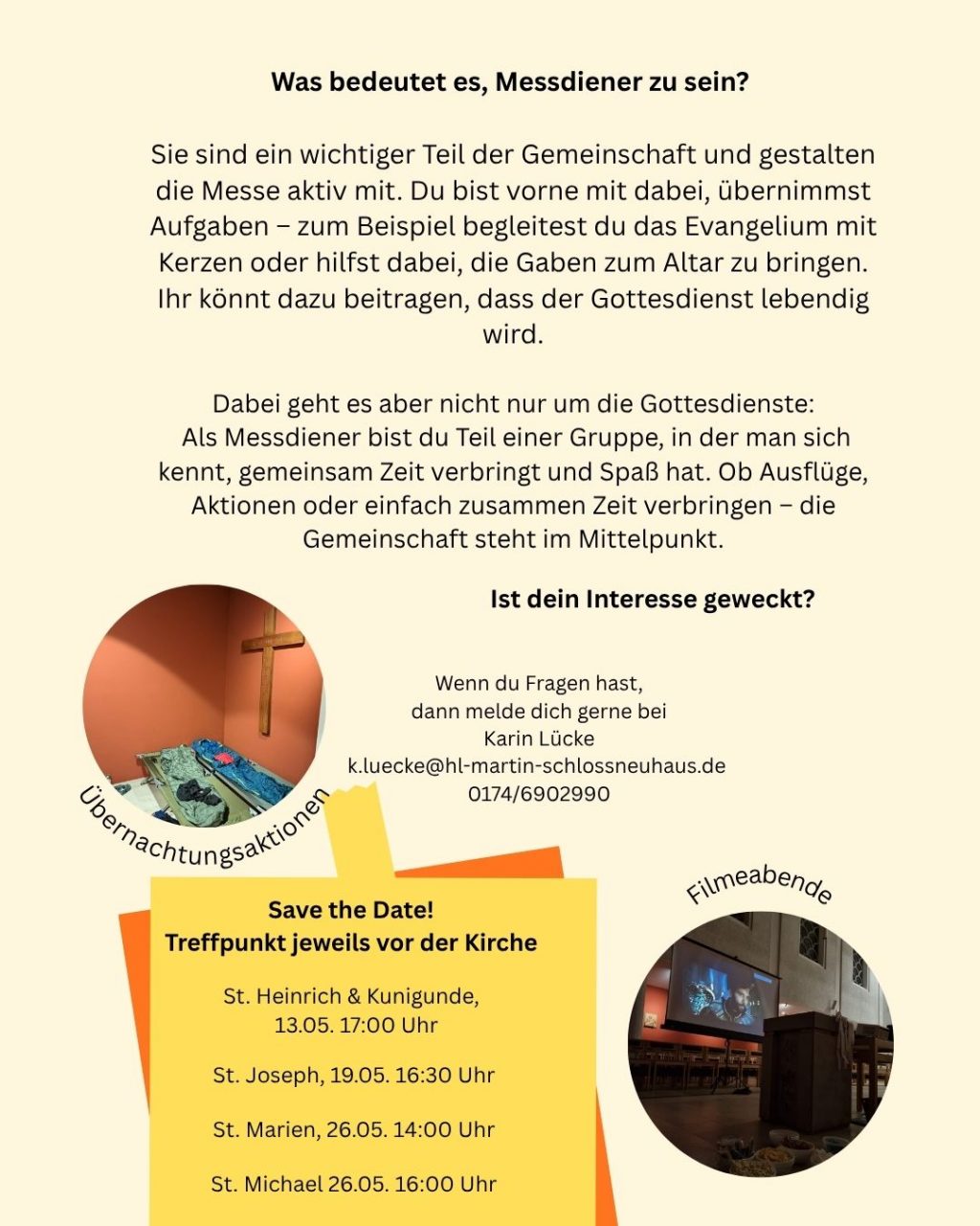 Als Messdiener bist du Teil einer Gruppe, in der man sich kennt, gemeinsam Zeit verbringt und Spaß hat. Ob Ausflüge, Aktionen oder einfach zusammen Zeit verbringen – die Gemeinschaft steht im Mittelpunkt.