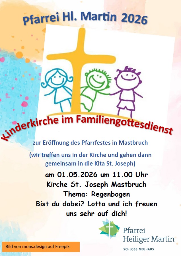Wir laden Sie herzlich ein zum Pfarrfest in St. Joseph Mastbruch am Freitag, 01. Mai. Beginn ist um 11 Uhr mit dem Hochamt. Ab 12 Uhr wird der Maibaum aufgestellt und der Kinderflohmarkt beginnt. Dort können große und kleine Kinder alles, was das Kinderherz begehrt, kaufen und verkaufen. Jeder, der Lust hat, sich mit einem kleinem Tisch oder einer Decke einzurichten, ist herzlich willkommen. Gegen 14 Uhr startet das Unterhaltungsprogramm für die ganze Familie. Dann gibt es noch T-Shirts bemalen im Kindergarten und die KLJB bietet gesunde Vitamine an der Saftbar an. Für das leibliche Wohl ist natürlich auch gesorgt. Die Frauengemeinschaft bittet um zahlreiche Salat– u. Kuchenspenden. Diese können ab 11 Uhr im Pfarrzentrum abgegeben werden. An dieser Stelle bereits ein herzliches Dankeschön an alle fleißigen Spender!